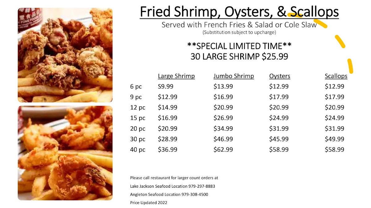 Welcome to Lake Jackson Seafood, where the essence of fresh, flavorful seafood comes to life. Among the highlights of the menu, you'll find fried shrimp, oysters, and scallops, all perfectly prepared to tantalize your taste buds. The house steaks provide a hearty option for those seeking a bit of variety. Guests rave about the succulent fried catfish, with one reviewer calling it “really, really good,” and the seafood gumbo is noted for its generous portions and rich flavors.
